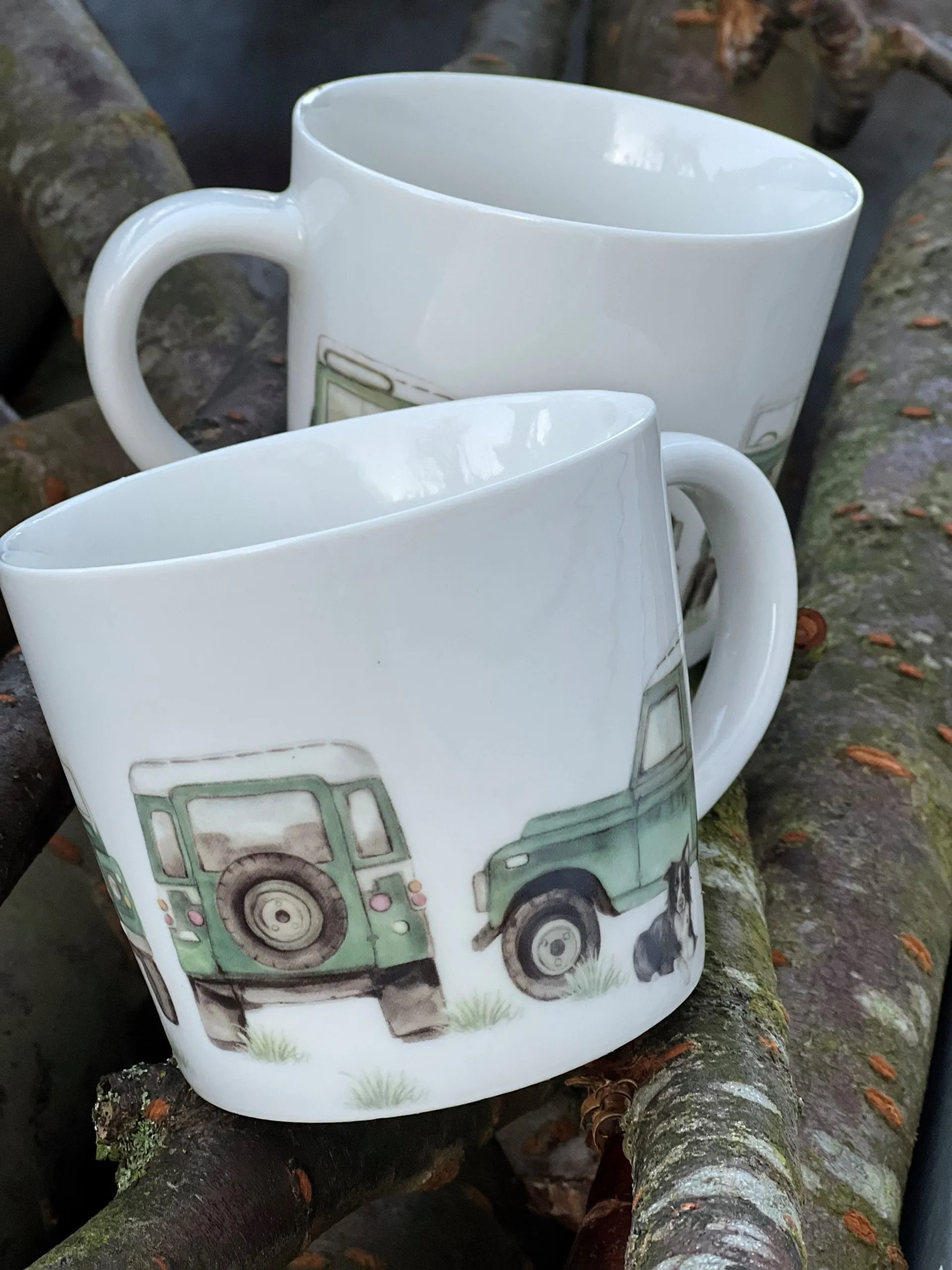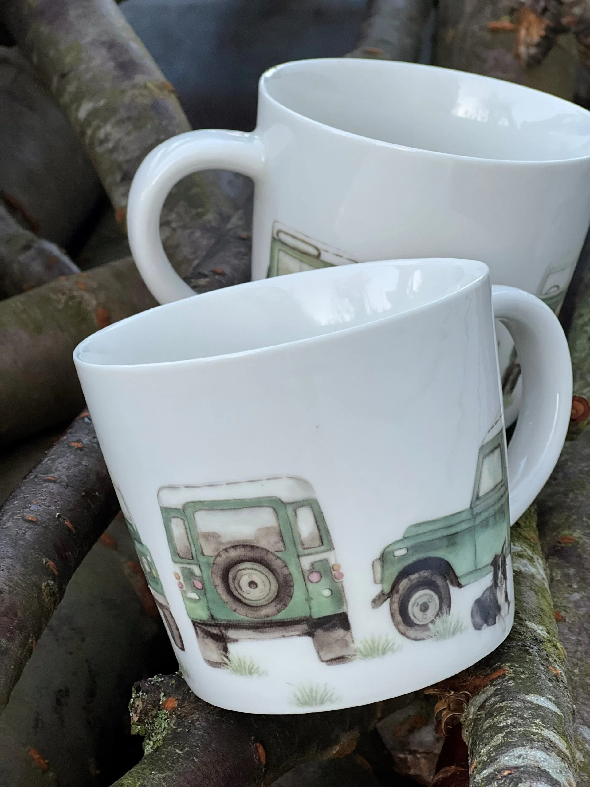 Land Rover och Collie – perfekt för oss som älskar både bilar och hundar! Unik mugg.